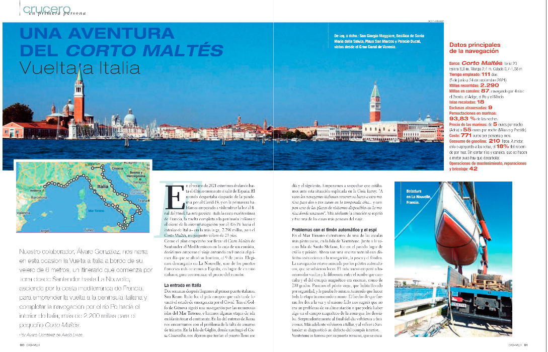 La revista Skipper, la de mayor tirada de la náutica en España, ha dedicado en su número de agosto un reportaje sobre la vuelta a Italia del Corto Maltés, experiencia relatada por el autor Álvaro González de Aledo Linos en el libro ¿Cuándo llegamos?.