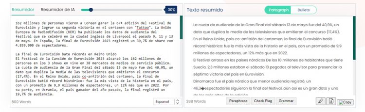 Una IA que escribe libros va más allá de la redacción del cuerpo de la obra. Un ejemplo es esta herramienta nos permite resumir textos, de corta y larga extensión. Incluso podrás filtrar un resumen desde el 25% (texto muy resumido) hasta el 75% (texto poco resumido).