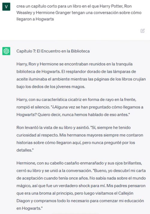 Aquí un ejemplo de un diálogo entre personajes de Harry Potter creado por Chat GPT, y que puede darte un ejemplo de cómo usar la inteligencia artificial para escribir textos: