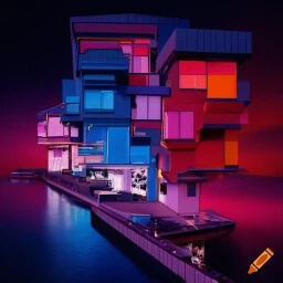 Este es uno de los dibujos que nos genera si le pedimos “Un paisaje futurista y colorido con edificios del revés”: