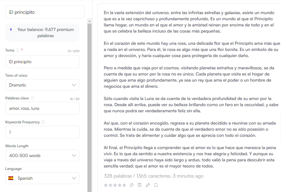 Esto es un ejemplo de un del uso de la IA para escribir historias. Como resultado, un texto sobre El Principito, con un tono dramático y con las palabras claves amor, rosa y luna:
