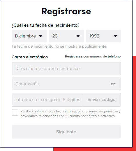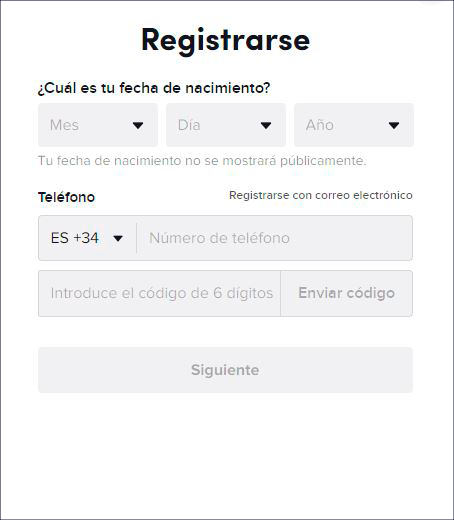 TikTok te pedirá, durante el proceso de registro, varios datos como son tu fecha de nacimiento, teléfono, o mail: